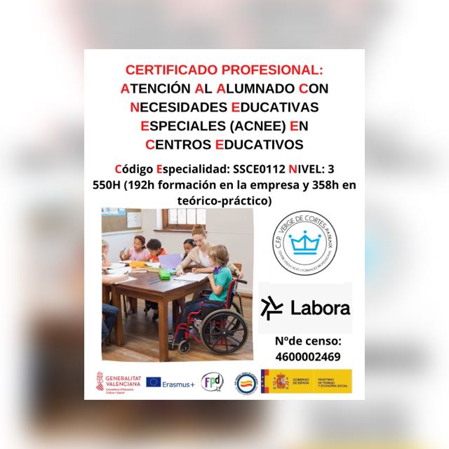 El Certificado de Profesionalidad SSCE0112 de Atención al Alumnado con Necesidades Educativas Especiales (ACNEE) en Centros Educativos tiene una duración total de 550 horas, de las cuales 470 horas son de formación teórica (Módulos Formativos) y 80 horas son de Módulo de Formación Práctica en Centros de Trabajo.